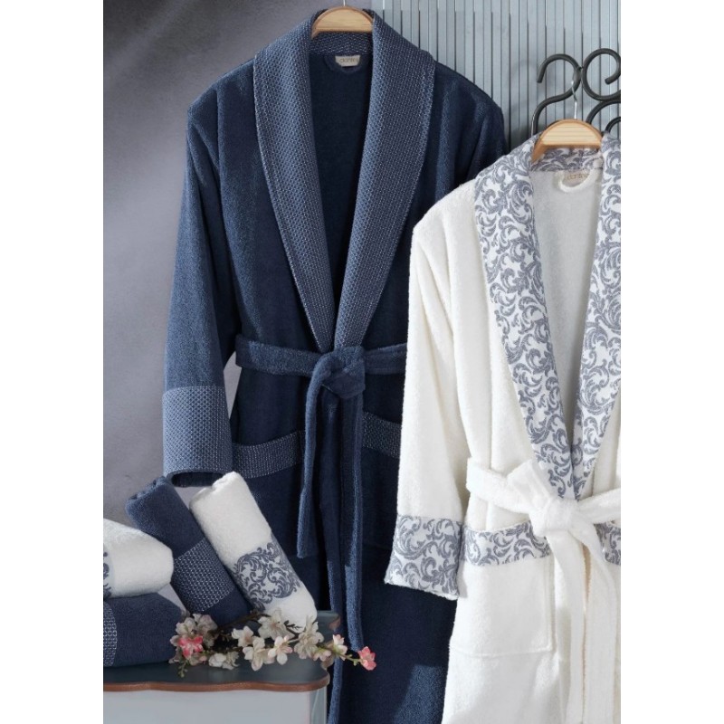 Продукт с доказано качество и стандарт за екологичност. Красива бродерия на реверите на халатите и на кърпите. Бието на реверите завършва с детайл -паспел лента или шнур. Жакардова вложка на яката. Халатите се отличават със стилен дизайн и превъзходно качество, обединяват вашия комфорт при релакс. Освен, че ви помага да облекчите умората от деня с меката си памучна текстура, той превръща вашата рутина в банята в луксозно изживяване със своите стилни шарки и цветови опции. Тези продукти, са перфектни като избор за подарък, както и за ежедневна употреба.