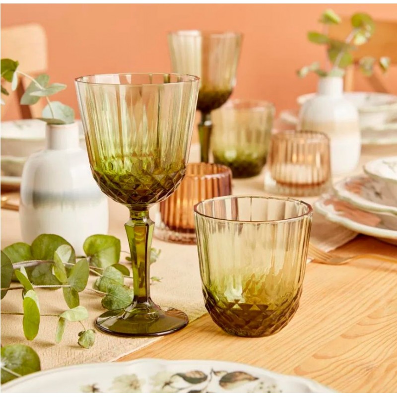 Дебелостенно цветно стъкло с релефни масивни детайли. Ретро визия, елегантни и модерни чаши, които в комбинация с подходящия сервиз, придават уникална визия на масата.