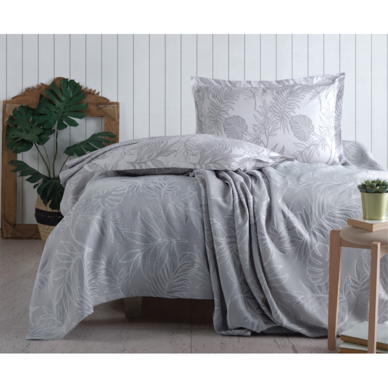 Комплект жакардово пике, калъфки и чаршаф JUNGLE LEAF - сив